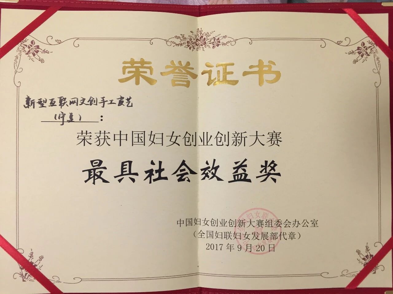 在中国妇女十二大期间,乔雪和代表们参观了中国妇女儿童博物馆,看到了自己2017年参加中国妇女首届创业创新大赛的相关展览,图片中,乔雪身着红色战袍,站在舞台中央,自豪溢于言表那次大赛,她的“新型互联网文创手工皮艺”,从全国千余个参赛项目中脱颖而,经过路演、答辩等众多环节,最难于言表的是那次大赛,她的“ 新型互联网文创手工皮艺”, 最终以高分荣获最具社会效益金奖。