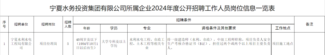 宁夏水务投资集团有限公司(以下简称“宁夏水务投资集团有限公司”)成立于2008年11月29日,为宁夏国有资本运营集团有限责任公司全资子公司,注册资本金11.41亿元。主要承担自治区公益性、准公益性、经营性水务项目、环保项目开发、建设、运营和管理等工作。根据企业发展需要,现面向社会公开招聘工作人员,具体事宜公告如下:2.招聘单位基本情况:宁夏水利水电工程局有限公司是区内水利建设领域的引领者和骨干力量,具有市政、建筑工程施工总承包、电力、石油化工、机电工程施工总承包二级、地基基础工程专业承包一级等26项专业承包资质。多次荣获“全国优秀水利企业、全国质量管理先进单位、全国水利安全生产标准化一级单位、国家级守合同重信用企业、中国水利企业100强企业、宁夏百强企业、宁夏建筑业20强施工企业”等荣誉称号。2.各岗位要求具体年龄(具体年龄以应聘人员有效身份证上的日期为准,自公告发布之日起计算);3.拥护中华人民共和国宪法,拥护中国共产党领导和社会主义制度;4.遵纪守法,品行端正,具有良好职业道德,能够履行国有企业工作人员的义务,无不良记录;5.具有适应岗位要求的身体条件和心理素质,无重大疾病和心理障碍;8.受到组织处理或者党纪、政务处分,在影响期内的;涉嫌违纪违法正在接受有关机关审查尚未作出结论的;国家法律法规、党纪政纪和有关政策另有规定不能从事应聘岗位的不得报名;9.与用人单位管理人员(管理岗位及职能部门人员)有亲属关系(直系血亲和三代以内旁系亲属)的,用人单位管理人员应主动回避。详见《宁夏水务投资集团有限责任公司所属企业2024年度公开招聘工作人员岗位信息一览表》。1.发布公告:通过自治区国资委、宁国运集团、宁夏水投集团网站等平台发布招聘公告,符合条件者均可报名,每人限报1个岗位,多报视为无效报名。2.报名时间:2024年10月30日8:30至2024年12月31日。3.报名方式:采取网上报名,报名者在规定时间内登陆宁夏水利水电工程局有限公司官网下载简历模板,接收简历邮箱为:nxslsd4091586@sina.com,电子邮件主题为:“姓名+应聘岗位”,不接受电话报名。4.报名需提交的材料:应聘报名表、身份证、学历证书、学位证书、专业技术职称证书、职(执)业资格证书、任职及相关经营业绩证明材料扫描件以及近期1寸免冠证件照(电子版),验证有效期在6个月以内的《教育部学历证书电子注册备案表》或《学籍在线验证报告》等报名材料电子版。填写应聘报名表信息不全,资料提交不完整的,视为无效报名。应聘人员应对所提交资料的真实性、完整性负责,信息不全或错误、标注不清、资料提交不完整的,发现与事实不符的,视为无效报名,取消应聘资格。1.资格审查贯穿于招聘全过程。招聘领导小组对应聘者提供的报名材料进行资格审查,不符合应聘条件的,取消应聘资格。2.报名截止后对应聘人员提交的报名资料进行资格初审,不符合应聘条件的,取消应聘资格,资格初审通过的,通过电话或短信通知进行现场资格审核。报名结束后5个工作日内,应聘人员未接到通知,视为资格审核未通过,不再另行通知应聘人员。3.现场资格审核需准备材料:应聘报名表、身份证、学历证书、学位证书、专业技术职称证书、职(执)业资格证书、任职及相关经营业绩证明材料、验证有效期在6个月以内的《教育部学历证书电子注册备案表》或《学籍在线验证报告》、户口所在地公安局开具的无犯罪记录证明和银行出具的个人征信报告。以上资格复审所需资料需提供原件及复印件各1份,核验后原件退回。现场资格审核与资格初审结果不一致的,以现场资格审核结果为准。4.通过资格条件审查合格人数与招聘岗位人数的比例不得低于3:1。如果不足3人,经招聘工作领导小组研究后予以延期、放宽条件或取消岗位。1.考试形式。根据报名和资格审查情况,宁夏水利水电工程局有限公司项目经理岗采取直接面试形式,不受报名岗位人数比例限制。2.考试内容。面试以结构化/半结构化方式进行,采用百分制计分,主要测试应聘人员的基本素质、专业知识、岗位适应能力、语言表达能力、逻辑思维能力、综合分析能力、应变能力及心理素质等。面试具体时间、地点另行通知。3.公布成绩。面试结束后,在宁夏水务投资集团有限公司网站公布成绩。1.综合考察。根据考试总成绩由高到低排序,按照1:1的比例确定考察对象人选,公司派出考察组,了解掌握考察对象的政治素质、履职能力、创新精神、工作业绩、职业素养、廉洁从业等。有不宜考察的情形或考察不合格的考察对象,将取消其拟录用资格,按综合成绩排名由高到低的顺序进行递补。2.会议研究。考察组根据应聘人员的综合得分情况、组织考察情况,结合岗位要求,提出拟录用人选建议,提请公司党委会议研究。(1)对拟录用人员在宁夏国有资本运营集团公司网站、宁夏水务投资集团公司网站进行公示,公示时间为5个工作日。对反映的问题经查实影响录用的,取消录用资格。对反映的问题一时难以查实的,暂缓录用,待查清后再决定是否录用。(2)公示期间,拟录用人员同步进行体检。体检参照机关事业单位招考工作人员体检通用标准进行。公司或应聘者对体检结果有疑问的,可按有关规定提出复检。拟聘人员应当在规定的时间内完成体检并提交体检报告,