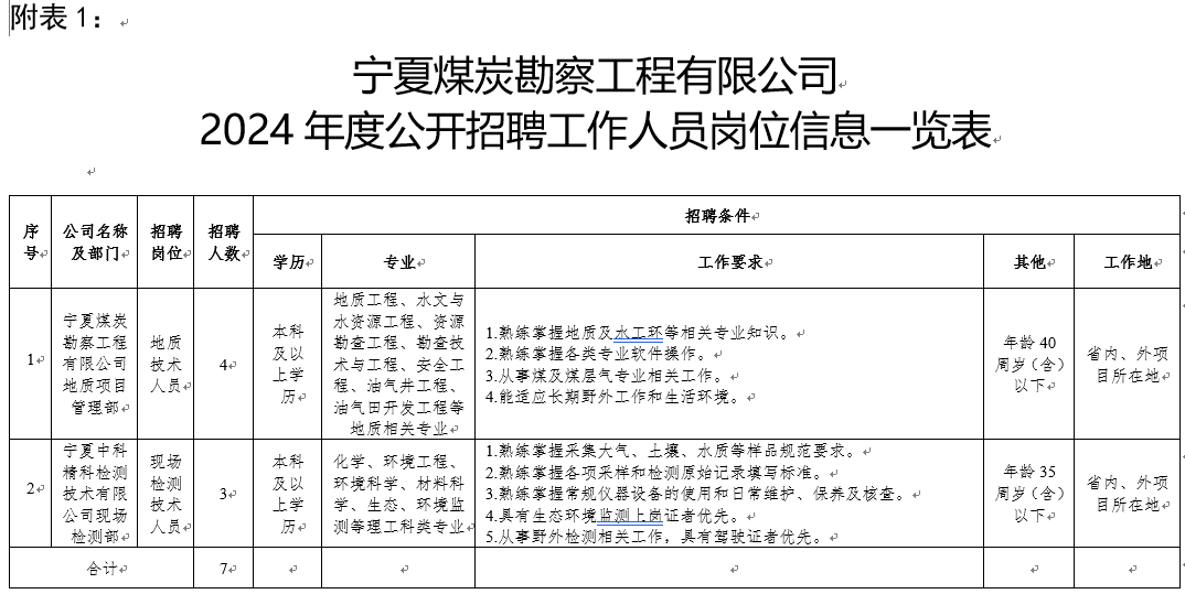 宁夏煤炭勘察工程有限公司(以下简称“勘察公司”)成立于1984年,为宁夏国有资本运营集团有限责任公司全资子公司,注册资本5000万元。主营业务为地质技术服务(含地质勘查、测绘工程、物探勘查)、检测检验技术服务(生态环境、土壤水质、煤炭质量)两大板块。根据公司发展需要,现面向社会公开招聘工作人员7人,具体事宜公告如下: