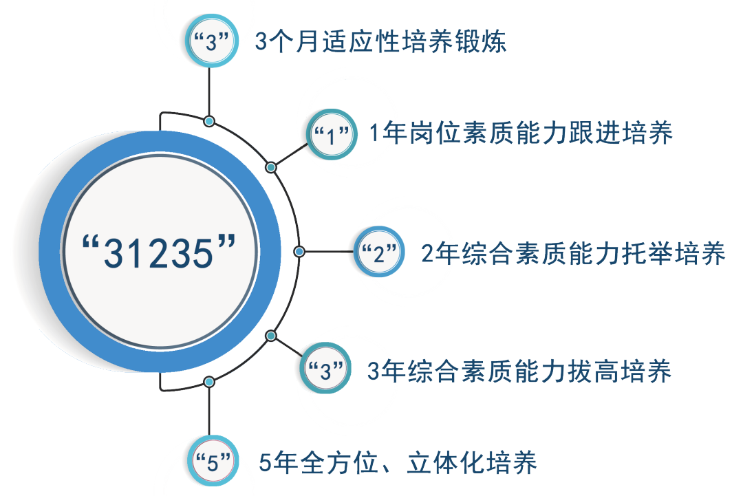 公司制定了“31235”阶梯式人才培养工作方案,通过培养思维、培养模式、培训体系的迭代更新,培养面向公司高质量发展战略需求、高度认同公司企业文化、具有高度职业责任感和使命感的专业化、高层次、创新型、复合型青年人才,锻造堪当重任的骨干力量。