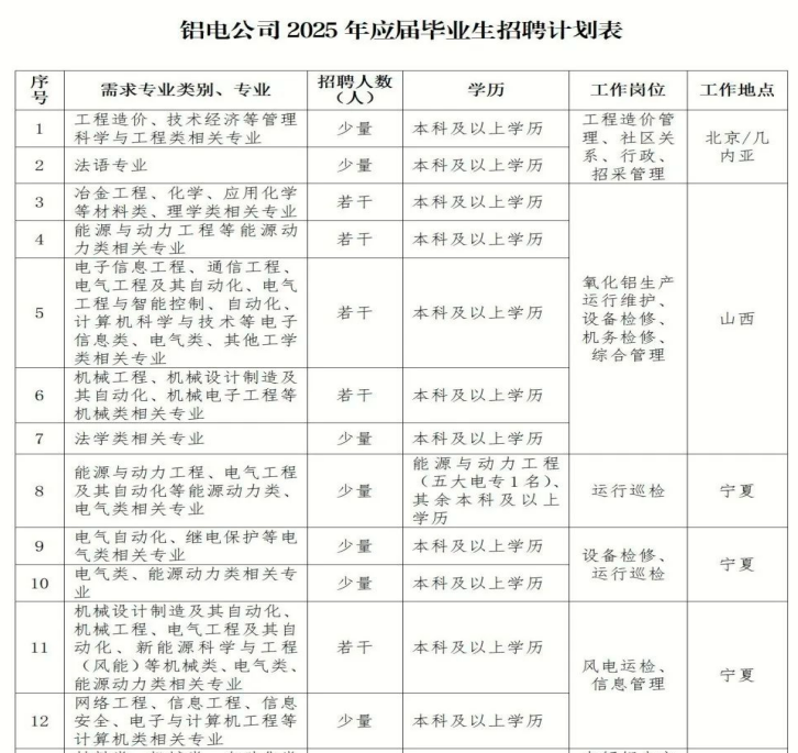 铝电公司肩负着国家电投集团“专业化产业子集团、铝业贸易服务平台、铝业科技创新平台”三大战略使命,致力于推进产业协同发展,打造成为产业一体化、管理专业化、机制市场化的全产业链创新型现代一流企业,迫切需要大批英才共同奋斗。真诚欢迎2025届优秀毕业生加盟,共同开创美好的明天!