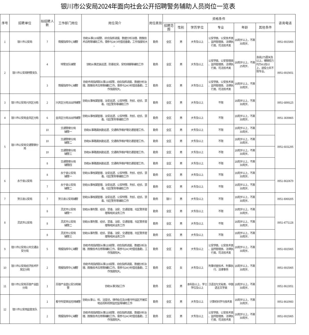 为进一步加强基层基础工作,有效解决公安机关警力紧缺问题,银川市公安局将组织实施2024年警务辅助人员(以下简称“辅警”)招聘工作,面向社会公开招聘辅警117名,现将有关事项公告如下:2.拥护中华人民共和国宪法,拥护中国共产党领导和社会主义制度;3.18周岁以上、30周岁以下(1993年7月10日至2006年7月10日期间出生);6.具有大学专科及以上文化程度,退役军人学历可放宽至高中;7.符合《银川市公安局2024年公开招聘警务辅助人员岗位一览表》(附件1)中招聘岗位要求的其他资格条件;9.同等条件下,优先招聘退役军人、退出国家综合性消防救援队伍人员、在职公安民警配偶、见义勇为积极分子和先进个人、公安类或者政法类院校毕业生。10.烈士、因公牺牲军人、人民警察、因工死亡辅警配偶及子女,单列计划,采取特殊定向方式招聘,免予体能测试和笔试。2.本人或者家庭成员、主要社会关系人参加非法组织、邪教组织或从事其他危害国家安全活动的;3.本人或者家庭成员、主要社会关系人编造、散布有损国家声誉、反对党的理论和路线方针政策、违反国家法律法规信息的;4.本人父母、配偶或家庭主要成员正在服刑或正在接受调查的,曾被判处过刑罚的;9.被开除公职、开除党籍、开除军籍或者因违纪违规被开除、辞(劝)退、解聘的;10.从事警务辅助工作合同期未满的或已与公安机关签订就业意向协议的;11.在机关事业单位招(录)聘中被认定有违纪违规行为且被记入诚信档案仍在记录期的;12.定向培养人员服务期未满或正在定向培养学习的;13.有较为严重的个人不良信用记录的,被列为失信惩罚对象的;14.新招聘事业单位工作人员在试用期内或未满最低服务年限的;15.普通高校在读的全日制非2024年应届毕业生的;17.与招聘单位负责人有夫妻关系、直系血亲关系、三代以内旁系血亲或者近姻亲关系的应聘者,不得应聘该单位负责人员的秘书或者组织(人事)、纪检监察、审计、财务岗位,以及有直接上下级领导关系的岗位;各招聘单位招考职位、人数、资格条件等信息详见《职位表》。应聘者对拟应聘职位要求的学历以及其他资格条件等需要咨询时,可直接与招聘单位联系(《职位表》中列有招聘单位联系电话)。本次招聘采用网络报名方式。报名、资格初审通过网络同步进行。报名网站为:http://bm.cptae.com/tip/。 (三)报名时间。2024年7月12日9:00至7月16日17:00,应聘者须在规定时间内报名。(四)报名程序。应聘者须仔细阅读招考公告,在报名平台中选择招考单位——银川市公安局,在对应岗位下填写报名表。应聘者应按要求填写本人应聘信息,每名应聘者只能应聘一个岗位,应聘信息必须与个人身份证件信息一致。应聘者要对填报信息的真实性、准确性负责。对伪造、涂改证件、证明等报名材料,或者以不正当手段获取应聘资格的;提供的涉及应聘资格的申请材料或信息不实,影响报名审核结果的,取消本次应聘资格。应聘者应按要求更正报名信息,在报名时间截止前没有提交更正信息的应聘者,不再补报。资格初审工作由各招聘单位负责,应在应聘者提交完整报名信息后1日内完成审核。通过资格初审的应聘者不允许更改应聘信息或改报其他岗位;在报名有效期内未通过资格初审的可以改报其他岗位;未通过资格初审且没有改报其他岗位的应聘者视为放弃;应聘者在报名最后1日提交报名信息,未通过资格初审的,报名系统关闭后,不再受理。(一)体能测评的时间和地点。体能测评在银川市设置考场,具体时间、地点请关注银川市公安局门户网站或“平安银川”微信公众号等官方平台公告。(二)体能测评的内容和要求。体能测评参照《公安机关录用人民警察体能测评项目和标准》(公政治〔2024〕60号)、国家公务员局《关于明确公安机关人民警察体能测评次数的函》(国公局函〔2012〕1号)相关要求执行。共设三项:男子1000米跑和女子800米跑(测评次数均为1次)、10米×4往返跑(测评次数不超过2次)、纵跳摸高(测评次数不超过3次)。体能测评的三个项目中有任何一项不合格或违规,视为体能测评不合格。