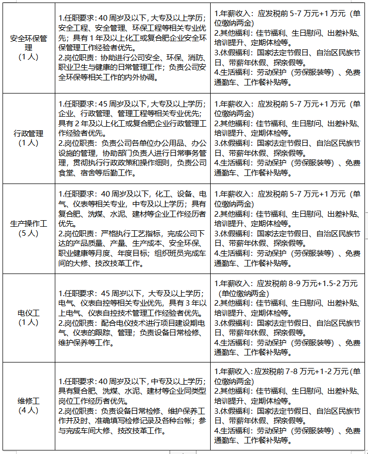 企业简介:宁夏泸天化生态肥业公司是泸天化股份公司旗下公司,投资4亿元,在宁夏宁东能源化工基地建设中国先进水平年产30万吨高效复合肥项目。项目建成后将集聚自动化、智能化、信息化,成为西北地区乃至国内复合肥标杆企业。招聘岗位: 报名须知:1.现泸天化集团内部员…