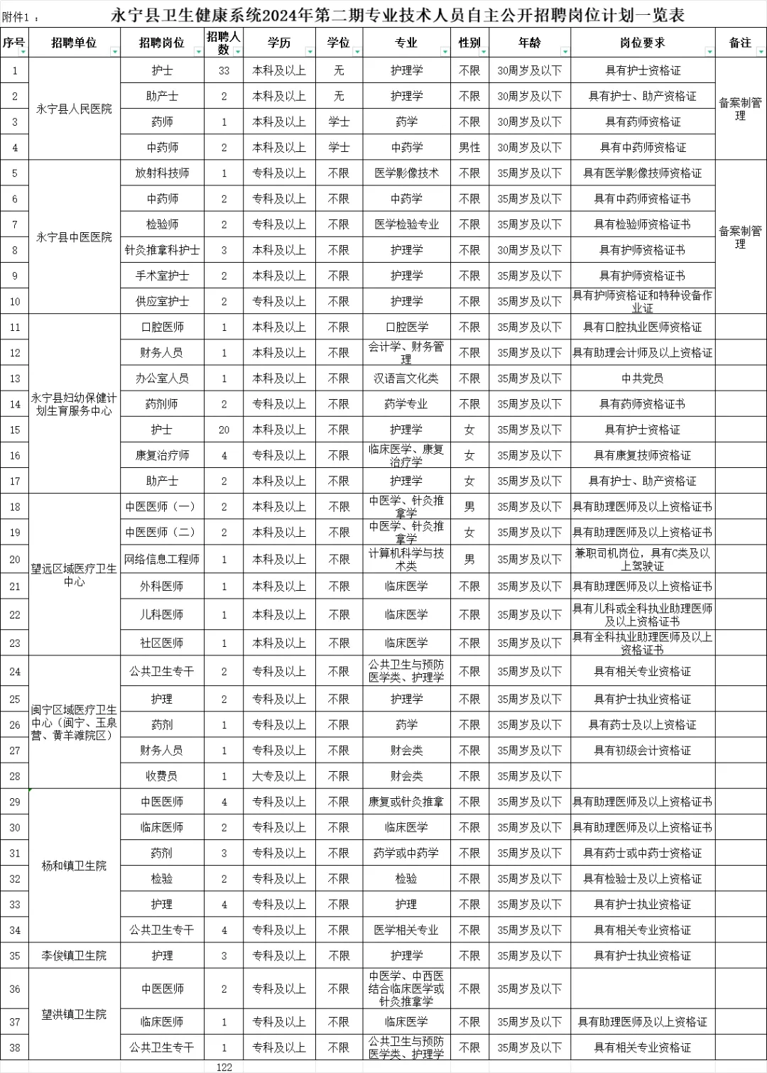 为满足我县医疗卫生单位建设、发展和群众看病就医需求,根据《宁夏回族自治区事业单位公开招聘工作人员实施办法》《关于进一步做好全区事业单位自主公开招聘工作的通知》《关于贯彻落实住院医师规范化培训“两个同等对待”政策的通知》等文件精神规定,现就永宁县卫生健康系统2024年第二期专业技术人员自主公开招聘有关事宜公告如下:永宁县公立医疗卫生机构2024年第二期计划面向社会自主公开招聘专业技术人员122名,其中永宁县人民医院望远院区38名、县城院区43名(中医医院12名,妇幼保健计划生育中心31名),各乡镇卫生院41名。具体岗位、条件等详情见《永宁县卫生健康系统2024年第二期专业技术人员自主公开招聘岗位计划一览表》(附件1)。