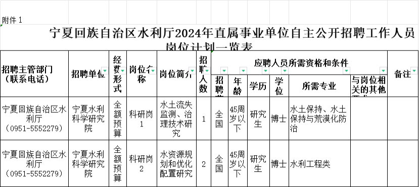 宁夏水利科学研究院计划招聘博士研究生3名,招聘岗位、资格条件及有关事项详见《宁夏回族自治区水利厅2024年直属事业单位自主公开招聘工作人员岗位计划一览表》(附件1)。