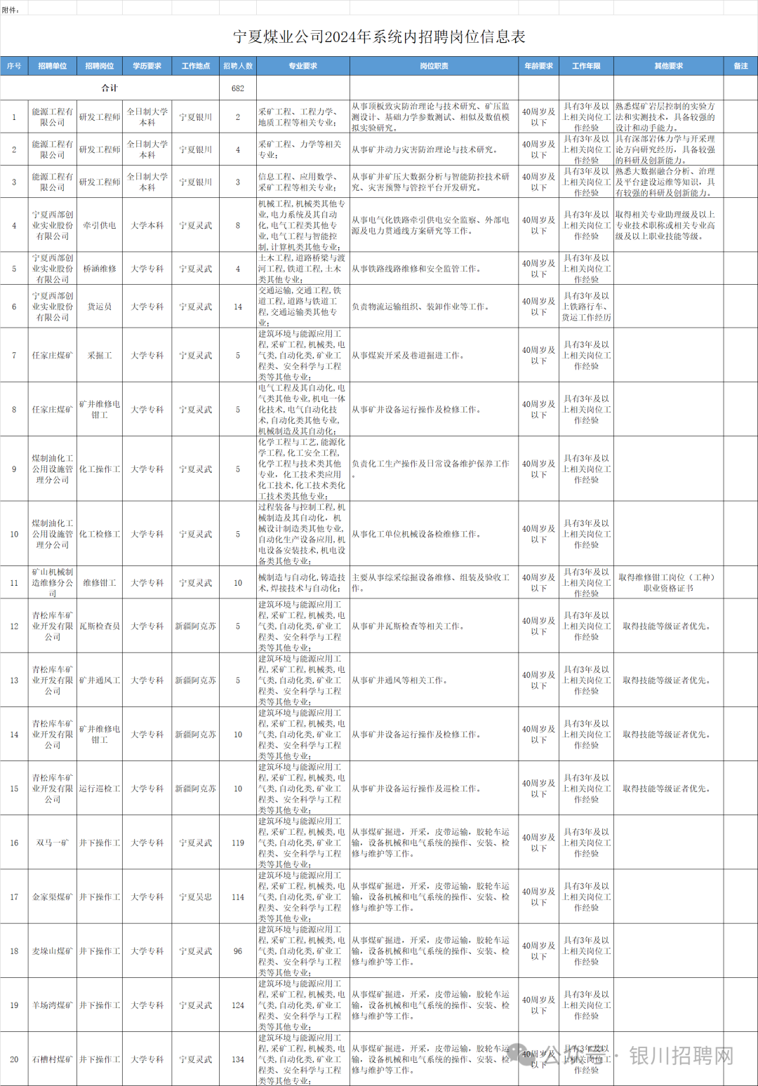 附件:宁夏煤业公司2024年系统内招聘岗位信息表