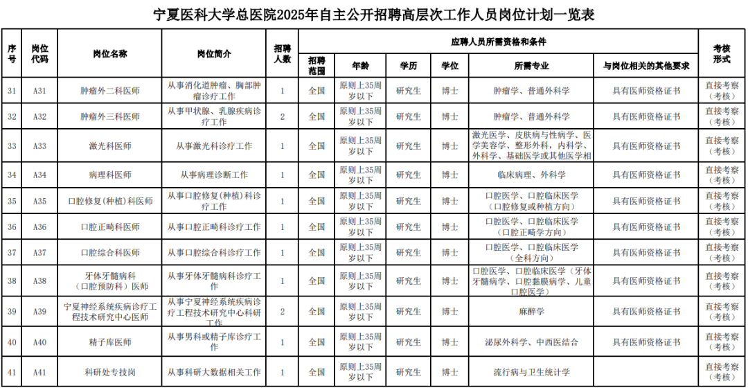 根据《宁夏回族自治区事业单位公开招聘工作人员实施办法》(宁政办规发〔2023〕9号)、《宁夏医科大学总医院工作人员招聘管理规定》等相关规定,现就宁夏医科大学总医院2025年自主公开招聘高层次工作人员有关事项公告如下。坚持公开、平等、竞争、择优;德才兼备、以德为先;专业匹配、人岗相适的原则,由医院自主组织实施,按照规定程序进行。2.拥护中华人民共和国宪法,拥护中国共产党领导和社会主义制度;3.遵纪守法、品行端正,具有良好职业道德,能够履行事业单位工作人员职责;4.具有正常履行职责的工作能力、文化程度、身体条件和心理素质;5.年龄一般原则上为18周岁以上、35周岁以下(1989年4月27日至2007年4月27日期间出生),可适当放宽至40周岁(1984年4月27日以后出生),出生日期以应聘人员有效身份证上的日期为准;7.报考面向应届高校毕业生招聘的岗位要求为2025年全国高等学校应届毕业生(含两年择业期内未落实工作单位的高校毕业生,不含各类委培生、定向生),应聘人员毕业时须取得学历学位证书;8.符合《宁夏医科大学总医院2025年自主公开招聘高层次工作人员岗位计划一览表》(附件1)中招聘岗位要求的相关资格条件。5.在机关事业单位招(录)聘中被认定有违纪违规行为且被记入诚信档案库仍在记录期的;7.全国普通高等学校在读的全日制非2025年应届毕业生;10.与招聘事业单位负责人有夫妻关系、直系血亲关系、三代以内旁系血亲或者近姻亲关系的应聘者,不得应聘该单位负责人员的秘书或者组织(人事)、纪检监察、审计、财务岗位,以及有直接上下级领导关系的岗位;本次共招聘博士研究生63人。招聘岗位、资格条件及有关事项详见《宁夏医科大学总医院2025年自主公开招聘高层次工作人员岗位计划一览表》(附件1)。招聘公告在宁夏医科大学总医院网站(http://www.nyfy.com.cn)、宁夏公共招聘网(http://www.nxjob.cn/)、宁夏高层次人才工作网(https:// gccfw.hrss.nx.gov.cn/nxgccrc/)公开发布。1.报名方式。应聘人员填写《宁夏医科大学总医院应聘人员登记表》(附件2),确认无误后建立压缩包(以“姓名+应聘岗位”命名)发送至邮箱zyzzrsc@nyfy.com.cn。每位应聘者只能应聘一个岗位。2.资格初审。按照招聘岗位条件及招聘要求,对应聘者报名资料进行资格初审,并通过打电话、发送短信等方式向考生进行初审结果确认。3.资格复审。以具体通知时间为准,在宁夏医科大学总医院进行。应聘人员参加资格复审须提交以下资料:登记表、告知书、承诺书、身份证、毕业证、学位证、执业资格证、职称证等岗位要求的相关证明材料原件及复印件1份。资格审查贯穿招聘工作全过程。经专业科室专家组对其学术能力和专业知识考核通过后,由医院组织面试,面试评委小组一般由5-7人组成,设主评委1名,专家评委占评委数量的70%及以上。1.体检。体检标准参照《公务员录用体检通用标准(试行)》(人社部发〔2016〕140号)和行业有关规定执行。进入体检的应聘者须在规定时间内完成全部体检项目,未按要求完成体检的视为自动放弃体检资格。体检在本院之外的其他公立医疗机构进行,体检费用由应聘者承担。2.考察。考察工作由我院组织人事处负责,主要通过查阅应聘者个人档案、实地考察等方式开展。按照德才兼备、以德为先的用人标准,重点考察应聘者的政治思想、道德品质、能力素质、工作表现、遵纪守法、廉洁自律以及是否需要回避等方面的情况。1.公示。根据面试、考察、体检结果,确定相关岗位拟聘用名单,在宁夏医科大学总医院官网公示5个工作日。对反映的问题经查实影响聘用的,取消招聘资格。对反映的问题一时难以查实的,暂缓聘用,待查清后再决定是否聘用。被聘用人员无正当理由逾期(自接到聘用通知20日内)不报到的,取消招聘资格。公示期满无异议者,提请院长办公会、党委会审定。2.聘用。本次公开招聘高层次人员按照《宁夏回族自治区高层次人才优厚待遇实施办法》(宁组发〔2018〕5号)等相关文件执行,签订事业单位聘用合同,确立劳动关系,并按规定办理相关手续。(一)回避制度。凡与招聘单位相关人员有《事业单位人事管理回避规定》(人社部规〔2019〕1号)第六条所列亲属关系的人员,必须回避。评委和工作人员如有涉及《事业单位公开招聘人员暂行规定》(人事部令第6号)第二十七条情形的,均应回避,以保证招聘考试的客观公正。(二)加强监督。宁夏医科大学总医院纪检监察部门全程参与公开招聘工作,加强对公开招聘工作的监督。(三)考生自报名至拟聘用人员公示(资格审查、面试、体检、考察)期间,应确保报名时所填报的通讯工具畅通,以便联络,因所留通讯方式不畅所致后果,由考生自负。(四)在体检和考察环节,应聘者出现体检不合格、考察不合格、自愿弃权等情形,取消应聘资格。在招聘过程中,应聘者弄虚作假,或以其他不正当手段获取应聘资格,一经发现,取消应聘资格;如已经聘用,解除聘用关系。联系电话:0951-6743500(宁夏医科大学总医院组织人事处)0951-6744560(宁夏医科大学总医院纪检监察室)1.宁夏医科大学总医院2025年自主公开招聘高层次工作人员岗位计划一览表